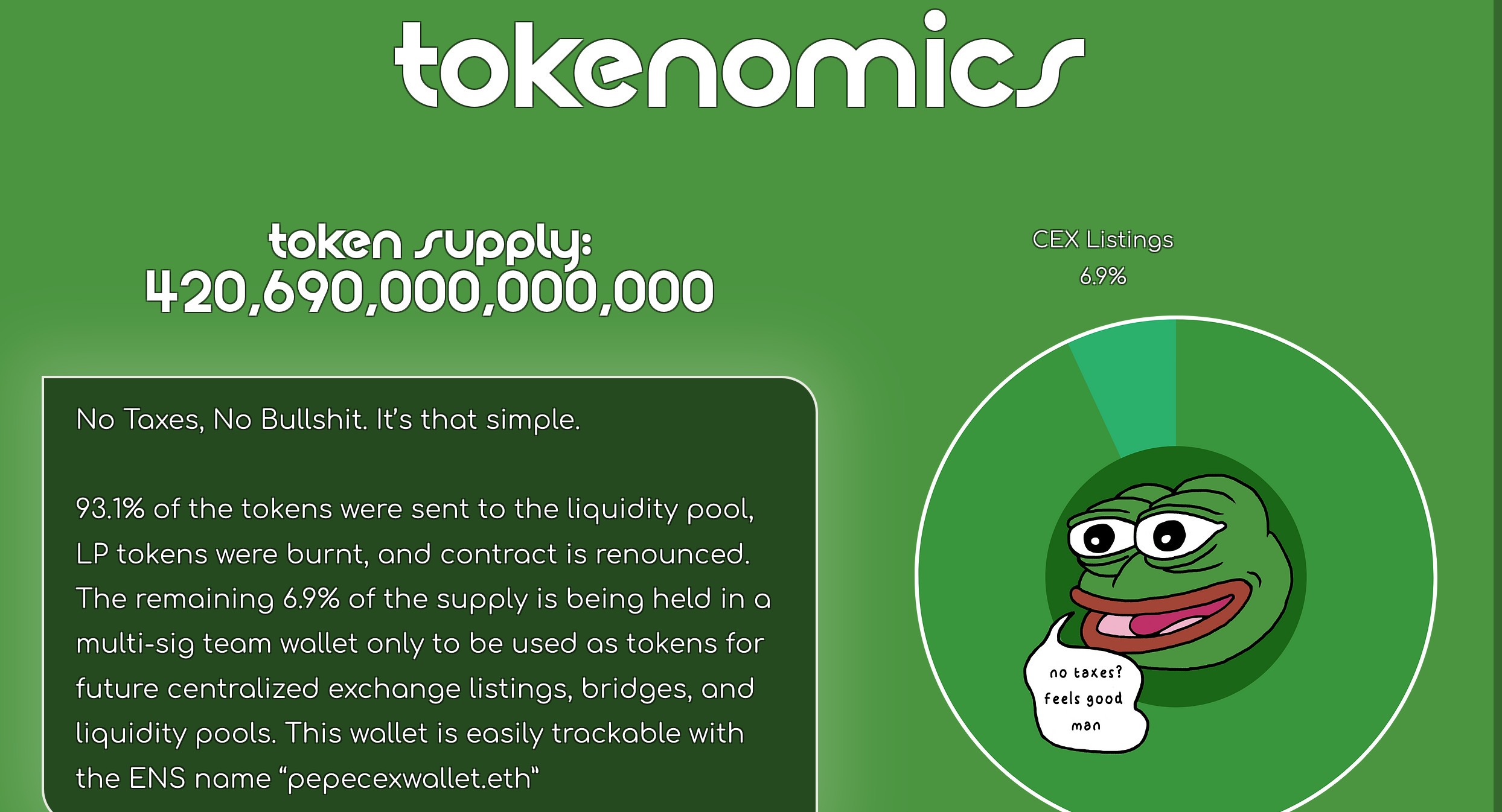 Pepe is tired of watching everyone play hot potato with the endless derivative ShibaCumGMElonKishuTurboAssFlokiMoon Inu coins. The Inu’s have had their day. It’s time for the most recognizable meme in the world to take his reign as king of the memes. Pepe is here to make memecoins great again. Launched stealth with no presale, zero taxes, LP burnt and contract renounced, $PEPE is a coin for the people, forever. Fueled by pure memetic power, let $PEPE show you the way. In Lord Kek we trust.